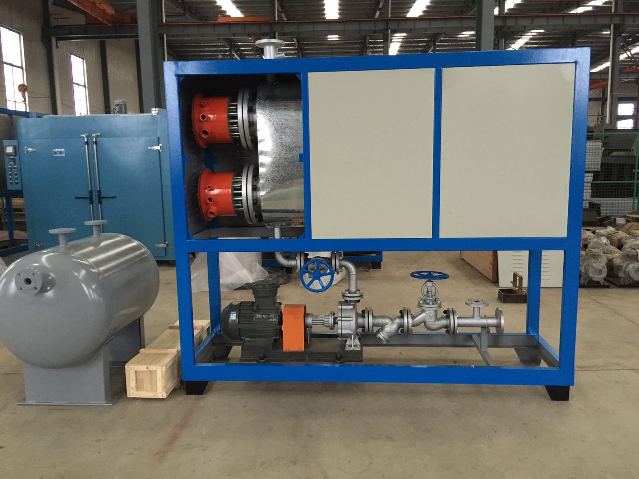 導熱油爐排氣流程: 1、導熱油通過膨脹槽注油口處加注,并通過膨脹口管道流入設備及油爐本體內,此時注油時一定要打開系統中所有的閥門(放油閥除外),讓導熱油流入筒體及需加熱設備內。 2、當液面顯示約為膨脹槽高度1/2時,停止注油。 3、首 行常溫排氣:接通電源,打開導熱油加熱器的進出口閥門及排氣閥(膨脹管道閥門需一直開著以及時補充油量),按動油泵啟動按鈕,油泵運行,油泵應按箭頭指示方向正常運行,壓力表壓力顯示在規定范圍內,視聽油泵運行情況,如有異,F象應立即停機檢查,將故障排除后再重新起動油泵,進行常溫下排氣,直至壓力表指示穩定。進行常溫排氣時,要注意觀察膨脹槽內的液位,當低于規定的液位高度時要及時進行補充。 4、升溫脫水:在確認常溫下運行正常后,即可進行升溫脫水排氣(操作前詳閱導熱油使用說明書及溫控儀使用說明書),升溫脫水排氣可按如下步驟進行: 步:升溫至100-120℃保溫 開始升溫時,應該控制升溫速度在50℃/h以內,并且監視壓力表顯示是否正常,如發現無壓力或壓力不穩,說明系統內仍有殘留氣體,此時要求按3要求重復進行常溫排氣操作,待系統壓力穩定后方可繼續,升溫至120℃后進行長時間保溫,保溫時間的長短與系統總容量及導熱油的質量有關。  第二步:升溫至150-180℃保溫。  排除油中輕組分、揮發物及殘余水分,請參照KRD系列導熱油加熱器系統脫水排氣曲線圖操作 第三步:脫水排氣完成后要關閉排氣閥(其它閥門無需關閉),投入正常升溫運行。 5、 升溫脫水排氣過程有關事項。 升溫過程中管路可能會發出碰擊的響聲,說明系統內有大量氣體或管道不暢,此時要降低升溫速度,待氣體排除便可消除聲響;如系管道不暢所至應予以排除。 脫水排氣過程可能會有大量氣體涌入膨脹槽,造成槽內導熱油外溢,操作前要在溢油管下安置好溢油容器。 進行脫水排氣時,現場必須有人員看守,發現異常及時處理。   對于所提的油泵無油或少許油流出的問題,解決方案如下: 1、 關閉出油口閥門,啟動油泵,觀察壓力表顯示情況,若無壓力,則說明回油口無油補充油泵,使得油泵空轉,無后續油及時補充,則請貴司檢查一下回油口的供油情況,此時請確保膨脹槽里有油并膨脹管道閥門打開和需熱設備有油并出油口閥門在打開狀態。 2、 如果以上要求都執行到位,壓力表還無壓力,請檢查油爐上的油泵、截止閥及過濾器是否堵塞。 3、 若壓力表顯示壓力值,而油泵、截止閥及過濾器并無堵塞,那油爐的出油口一定會按油泵所提供的流量進行流出。